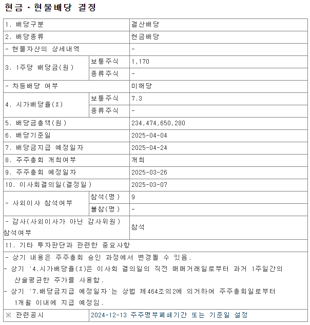 이후, 회복세를 보이며, 지난 2023년에는 다시 5.6%의 고배당을 실시하였고, 2024년에는 주주환원에 더욱 박차를 가하며, 7.3%의 높은 배당률을 기록하였습니다.