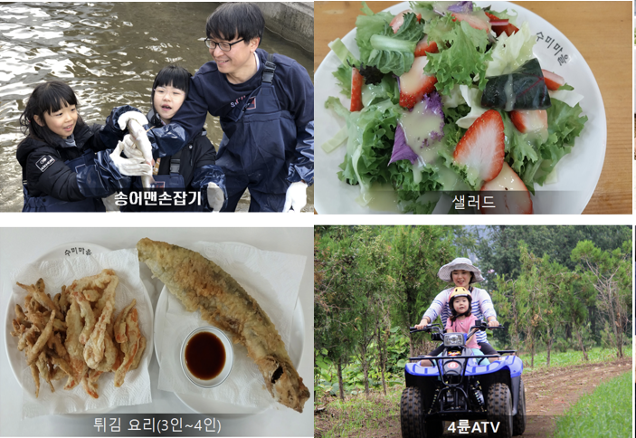 2. 패키지 선택: 송어맨손잡기체험, 튀김요리, 샐러드, 4륜 ATV, 다육화분만들기, 숯불바비큐꼬치, 피자만들기, 찐빵만들기