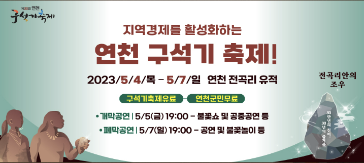경기도 5월 축제 첫 번째, 연천 구석기 축제는 한반도 최초의 인류가 살았던 연천 전곡리 유적에서 펼쳐지는 구석기체험 축제입니다. 연천 전곡리 유적은 30만년전에 우리나라에 매우 똑똑한 구석기 사람들이 살았다는 증거인 주먹도끼가 발견된 세계적인 유적입니다.