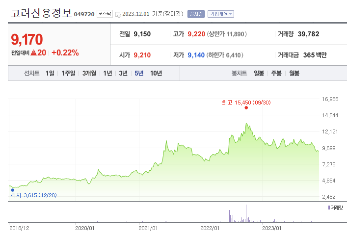고려신용정보의 주가는 21년부터 우상향 하고 있습니다. 경기 침체기에는 채권 추심 분야가 주목을 받는데, 경기가 어렵다보면 대출 연체율이 높아지고 이로 인해 채권 추심 시장의 수익성이 증가하기 때문입니다. 고점대비 다소 하락하긴 했으나, 현재 주가는 지난 2018년 대비 거의 3배 정도 증가한 수치입니다.