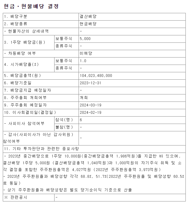 2023년 연간 배당금 (2분기, 결산 배당 진행)