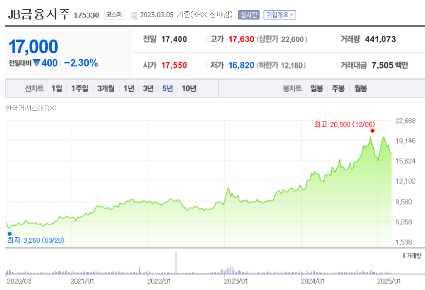 JB금융지주의 최근 5년간의 주가를 보면, 코로나 기간에 다소 하락하였다가, 이후 지속적인 상승을 보여주고 있습니다. 팬데믹 이후 인플레이션에 따른 금리 인상으로 금융지주들의 실적 상승이 주요 원인인 것으로 보입니다. 또한, 최근 정부의 밸류업 프로그램으로 인해 저PBR주인 금융주들이 주목 받으며 주가가 지속 상승하였습니다. 여기에 더해, JB금융지주는 '24년부터 분기 배당을 실시하며, 주주환원에도 힘을 싣고 있어, 주가 상승 요인으로 작용하는 것으로 보입니다.