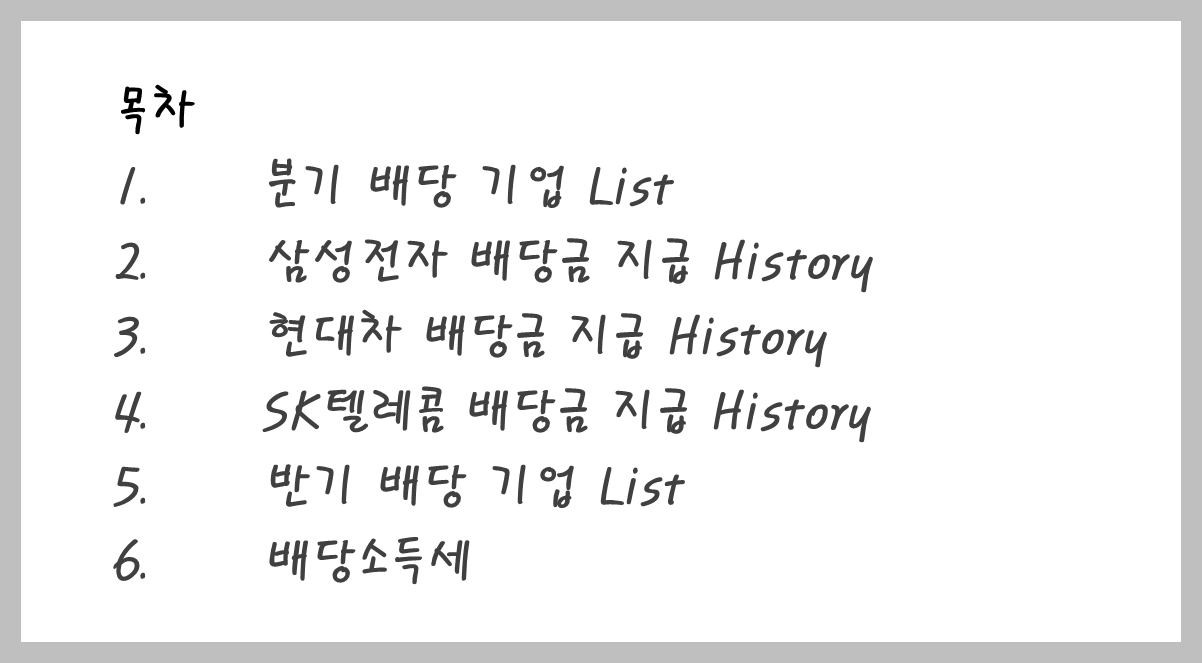 분기배당주에는 앞서 언급한 삼성전자와 현대차, 포스코홀딩스, SK하이닉스 등 우리나라를 이끌어 가는 대표적인 제조기업 뿐만 아니라 통신주인 SK텔레콤과 kKT, 그리고 전통적으로 고배당 주에 속하는 금융지주들이 대거 포함되어 있습니다.