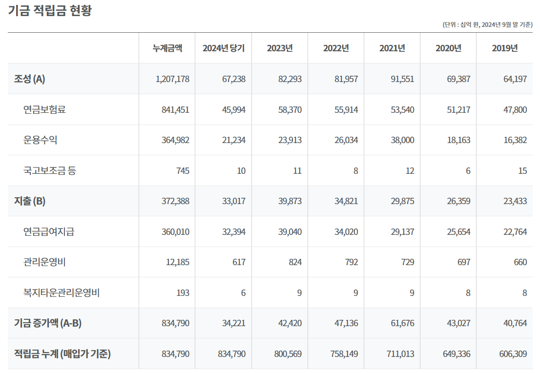 '24년 9월말 기준으로, 전체 조성된 기금 적립금은 1,207조원으로 이는 국민들이 낸 연금 보험료 842조에 운용수익 365조를 더한 수치입니다.