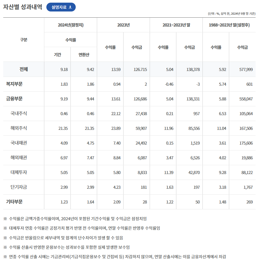 투자 자산별로 보면, 해외 주식과 해외 채권의 수익률이 가장 높아, 역시 국내보다는 해외 투자의 수익률이 높은 것을 확인할 수 있습니다. 이를 보면, 왜 기금이 국내 주식 투자 비중을 줄이고, 해외 주식 투자 비중을 늘리는지에 대한 설명으로 충분할 것 같습니다.
