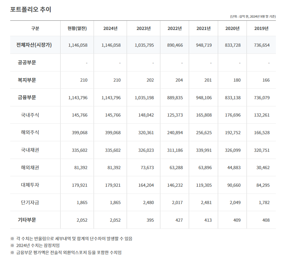 분산 투자: 국내외 주식, 채권, 대체투자(부동산, 인프라, 사모펀드 등)를 포함하여 다양한 자산에 투자함.