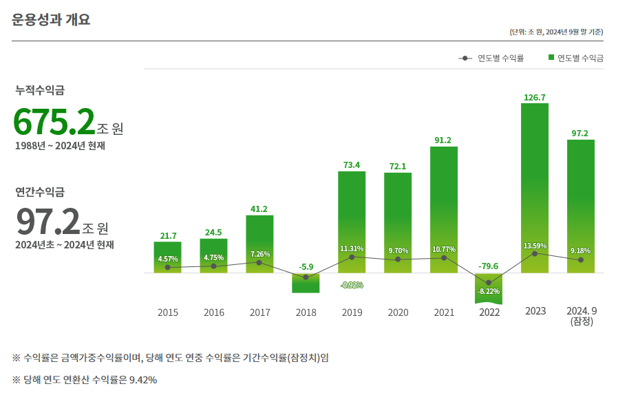 기금은 지난 2018년과 2022년을 제외하고, 2019년부터는 연 평균 10%를 약간 초과하는 수준의 수익류을 기록하고 있으며, 2024년은 운용수익이 거의 100조원에 달할 것으로 예상됩니다.