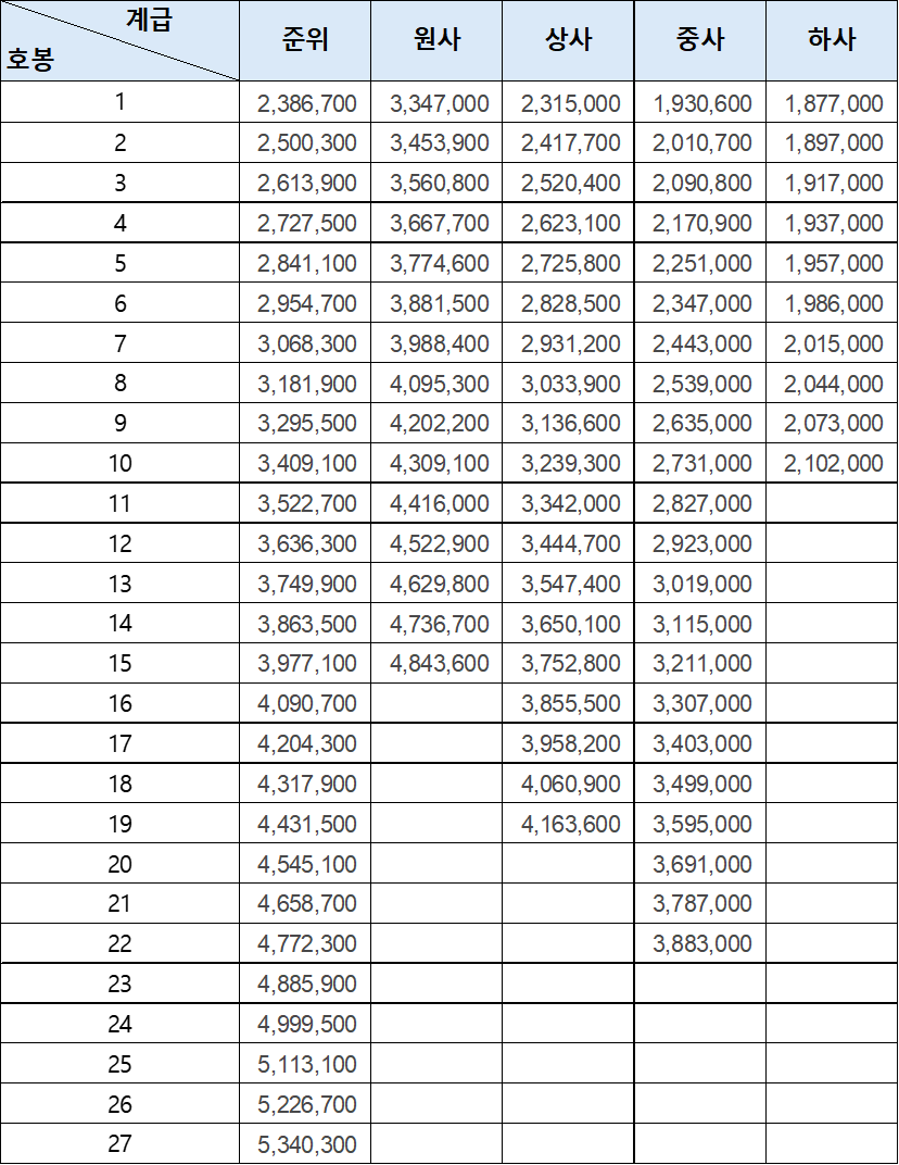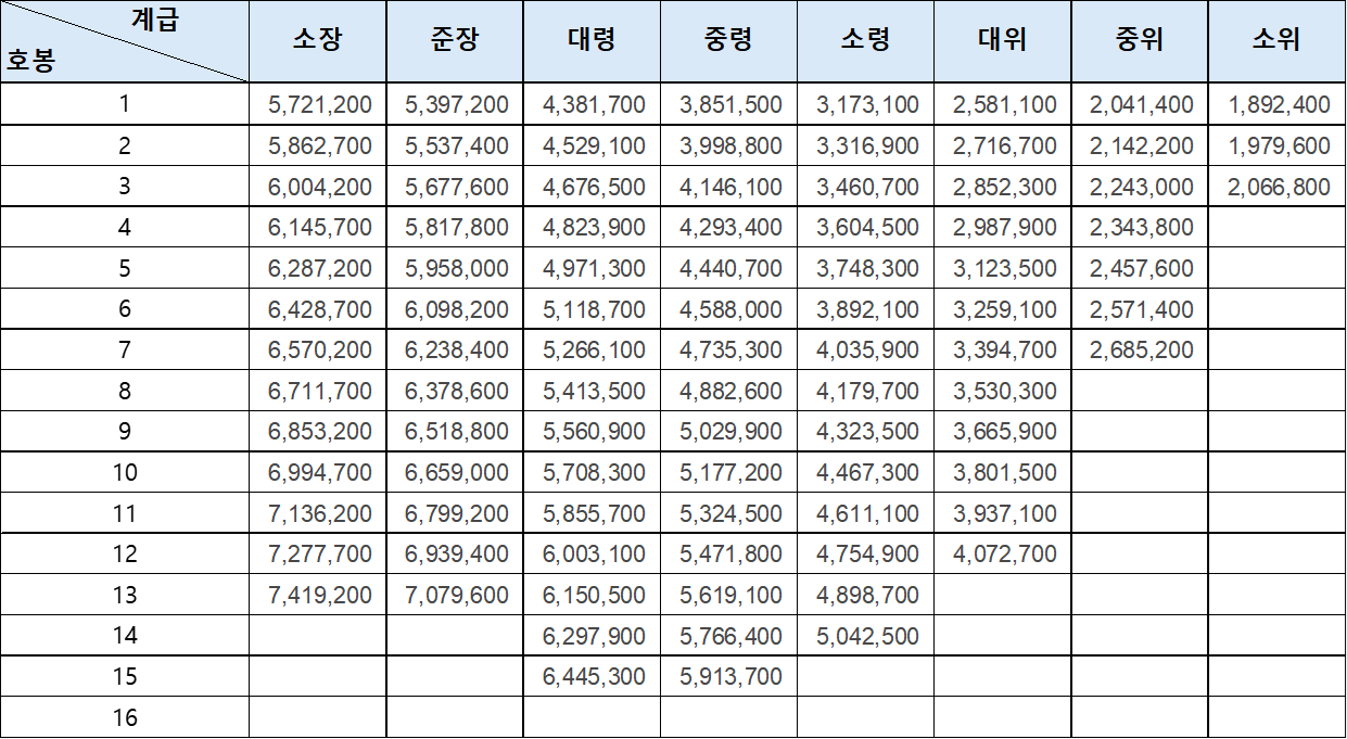군인 봉급표 (2024년, 직업군인, 급여, 월급, 연봉, 공무원, 장군, 소위, 대장)