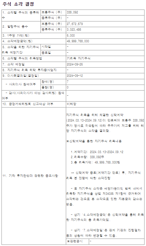 자사주 소각 주식 종류와 수 : 338,092주 (보통주)