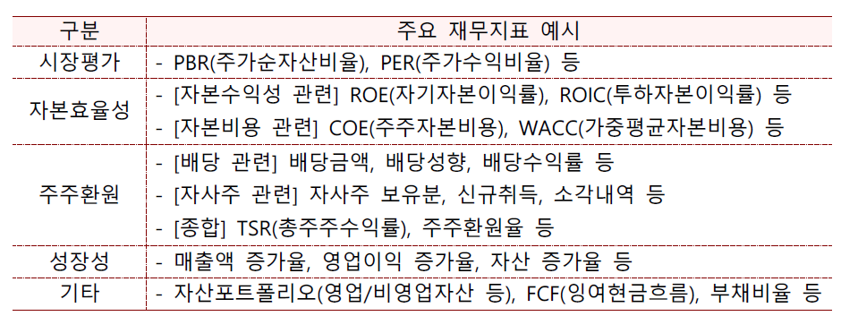 재무지표는 크게 시장평가, 자본효율성, 주주환원, 성장성 등으로 분류할 수 있습니다. 아래는 예시적인 지표이며, 새로운 지표를 선정할 수도 있습니다.