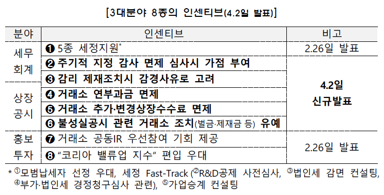 ▷ 지난 4월 2일, 기업 밸류업 관련 회계/배당부문 간담회에서는 기업 밸류업 표창을 받은 우수 기업에 대한 3대부문 8종 인센티브를 발표 하였습니다.