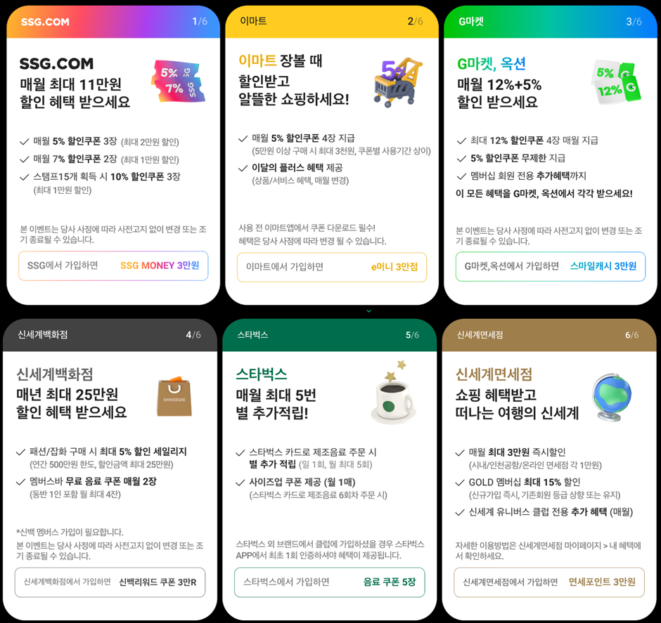 - SSG.COM, G마켓 / 옥션, 이마트, 신세계백화점, 신세계면세점, 스타벅스 등 6개 온, 오프라인 계열사