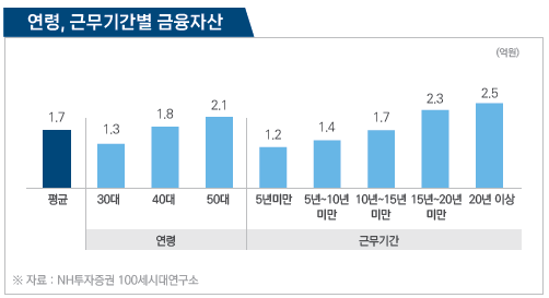 직장인들의 평균 금융자산은 1.7억원으로, 실물 자산 6.1억원 대비 현저히 낮은 모습을 볼 수 있습니다. 금융자산 역시 연령과 근무기간이 증가함에 따라 함께 증가하는 모습을 보이고 있습니다.