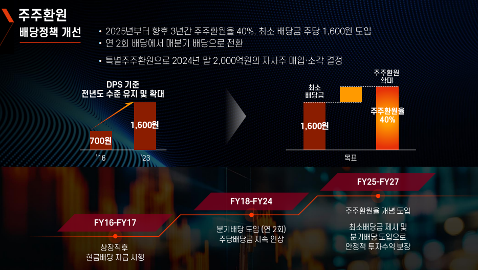 또한, 주주환원 측면에서 최소배당금 제시 및 분기배당 도입으로 안정적 투자수익을 보장하기 위해 노력하는 모습입니다.