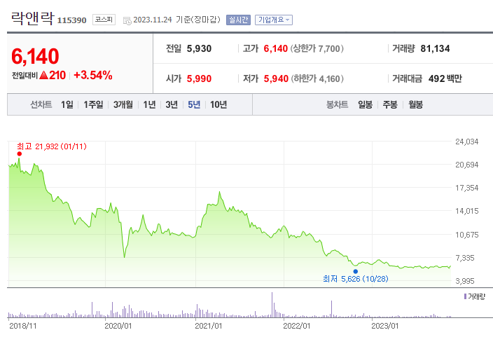 락앤락의 주가는 지난 2018년 말 최고가를 기록한 이후, 지속적으로 하향 곡선을 그리고 있습니다. 현재는 실적도 좋지 않고, 이에 크게 주가가 상승할만한 소재가 보이지 않아 투자 목적으로는 신중하게 접근해야 할 것으로 보입니다.