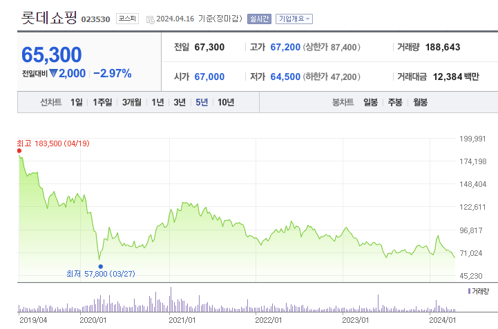 롯데쇼핑의 주가는 지난 '19년 이후 지속적으로 내리막길을 걷고 있습니다. 이는 롯데쇼핑 자체의 실적 부진 탓도 있지만, 쿠팡 등의 온라인 유통업체의 약진으로 인해 오프라인 위주의 유통업체들이 힘을 쓰지 못 하고 있는 상황 때문이기도 합니다. 더욱이 롯데쇼핑은 '21년과 '22년 당기순손실을 기록하며, 아쉬움을 남겼습니다.
