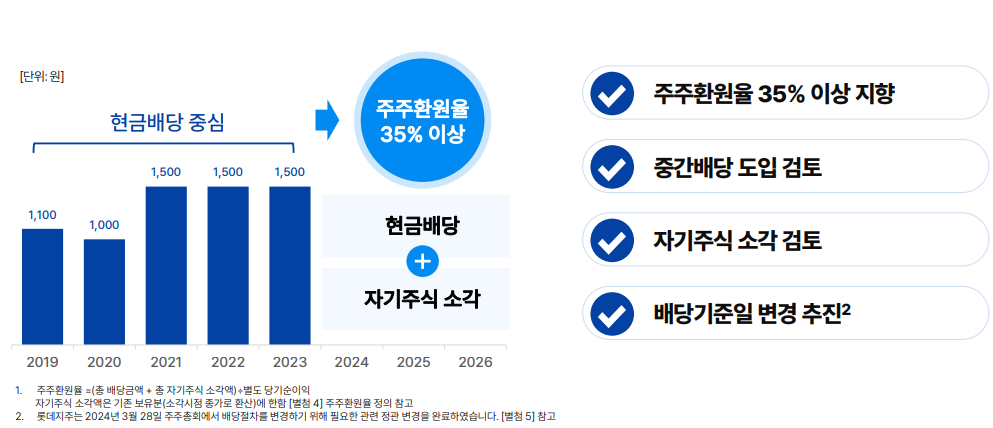 롯데지주는 향후 주주환원율을 35% 이상을 목표로 하고, 중간 배당 도입을 검토하기로 하였습니다. 또한, 자기주식 소각을 검토할 예정이며, 배당액 확정 후 배당기준일을 결정하는 '선 배당액 확정 후 배당기준일' 구조로 변경하도록 정관 개정을 마친 상태입니다.