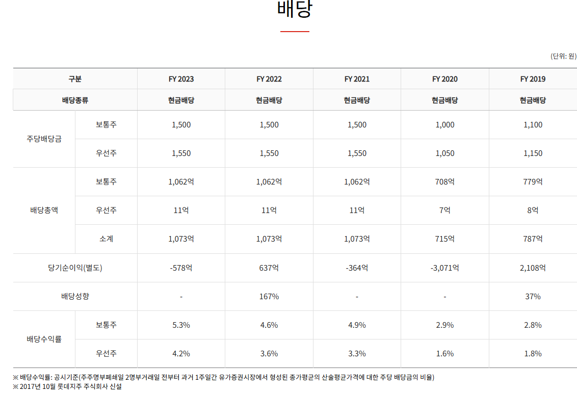 롯데지주는 보통주 기준으로 최근 3내년 평균 거의 5%에 육박하는 배당수익율을 기록하며 고배당주에 가깝습니다.