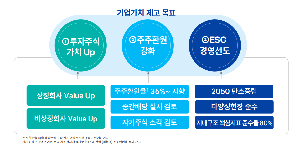 투자주식 VALUE UP을 위해, 상장회사 및 비상장회사 VALUE UP을 진행하며, 주주환원 강화를 위해 주주환원율 상승 / 중간배당 및 자사주 소각 검토를 진행할 예정입니다.