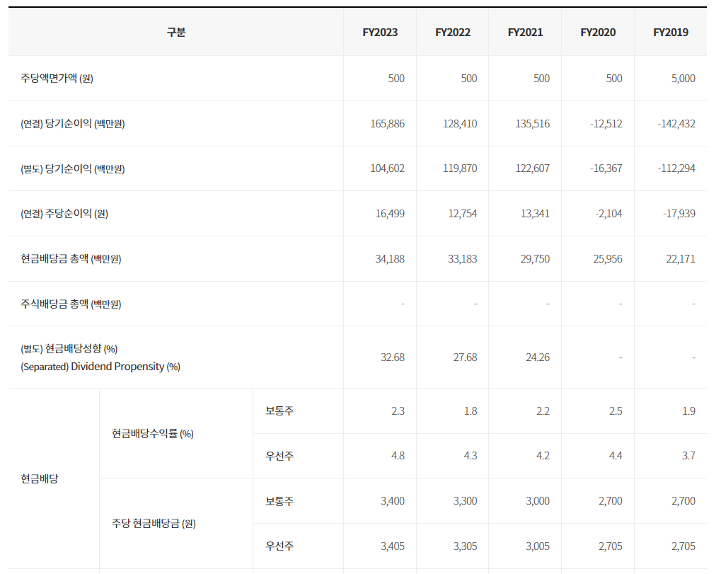 롯데칠성은 매년 결산 배당을 실시하고 있으며, 보통주는 2% 내외, 우선주는 4% 내외의 배당수익률을 기록하고 있습니다. 보통주 기준에서는 평균보다 오히려 조금 낮은 수준이라 볼 수 있겠으나, 우선주는 평균 정도의 수준으로 보여집니다. 향후 주주환원율 상승을 목표로 하는만큼, 배당수익률이 어느정도까지 올라갈 수 있을지 기대되는 대목입니다.