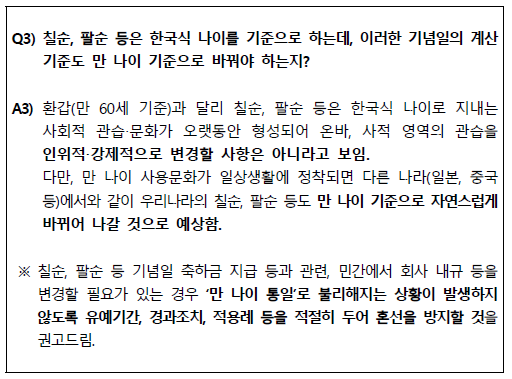 - 칠순, 팔순 등은 한국식 나이로 하는데, 향후 적용 방법은 ?\