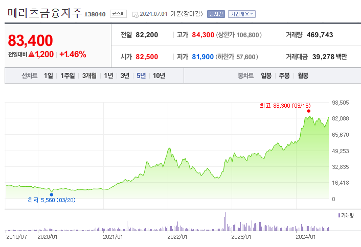 메리츠금융지주는 수 년 전부터 적극적인 주주환원에 나서며, 주가가 지속적인 상승세를 이어가고 있습니다. 이번에 밸류업 프로그램을 발표하면서 향후 주가에도 긍정적인 영향을 미칠 가능성이 높아 보입니다.