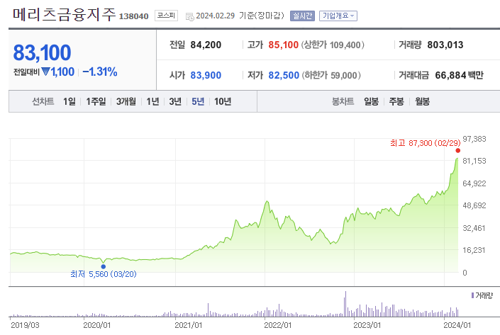 메리츠금융지주의 주가는 지난 20년 전저점을 기록한 뒤, 지속적으로 우상향하는 모습을 보이고 있습니다. 이는 지난 '19년 최대 주주가 승계를 하지 않겠다고 선언한 뒤, 지배구조를 전면 개편하고 주주환원을 대폭 늘렸기 떄문입니다. 이에 주가는 흔들림 없이 상승 중이며, 최근 정부의 밸류업 프로그램에 따른 저PBR 주들이 주목 받으면서 더욱 주가에 탄력을 받고 있습니다.