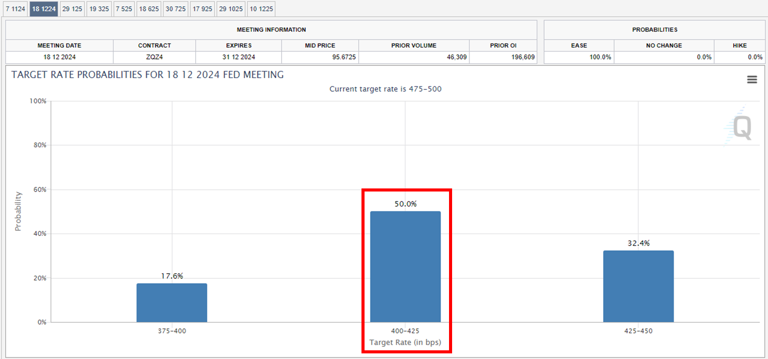아래 그래프는 12월 FOMC에서의 금리 전망으로, 12월에 현재보다 0.75% 인하된 4.00~4.25% 수준이 될 것이라는 확률이 50.0%로 가장 높습니다. 현재 12월까지 2차례의 FOMC가 남은 상황으로 (11월, 12월), 시장에서는 매번 0.25% 또는 0.50%의 인하가 진행될 것으로 전망하고 있습니다.