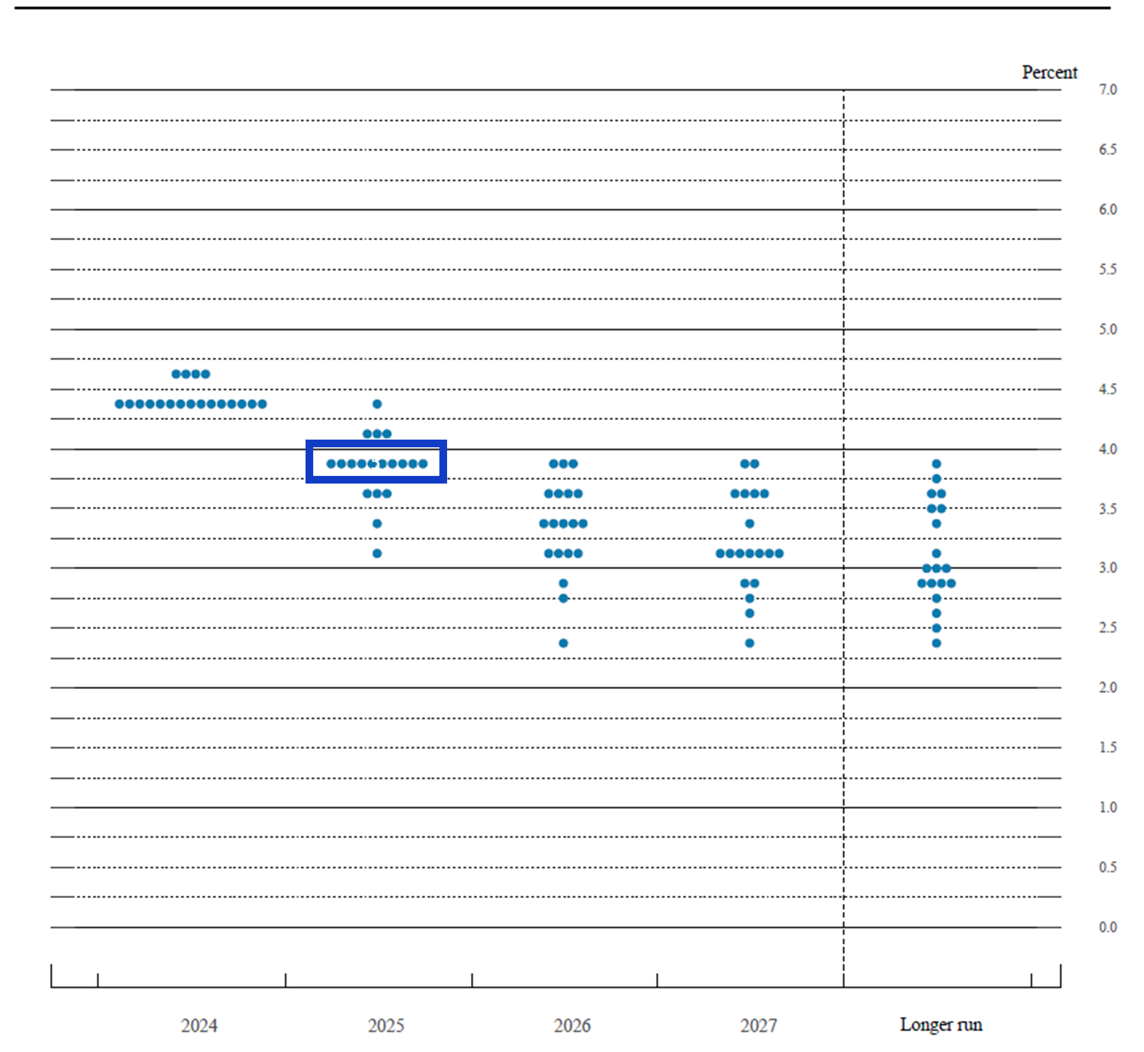 연준은 이번 FOMC 의사록에서, 아래 점도표와 같이 '25년 연말에는 기준금리 중간값이 3.9%에 도달할 것으로 전망했습니다. 이는 현재에 비해 0.50% 추가 인하가 이루어 질 것이라고 이해하시면 되겠습니다.