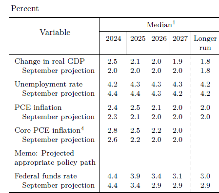 이번 FOMC에서도 아래와 같이 경제 전망에 대해 발표를 하였으며, 미국의 '24년 경제성장률을 2.5%로 이전 9월 전망 대비 0.5%를 증가 시켰습니다.
