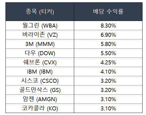 다우의 개에 편입된 10개 종목은 모두 배당 수익률이 3%가 넘지만, 배당 수익률이 높다고 투자 수익률이 높은 것은 아닙니다. 주가가 하락하거나 다우 지수보다 상승률이 낮은 경우엔 오히려 다른 종목 투자 대비 낮은 수익률을 올릴 수 있으니, 무턱대고 배당주에 투자하는 것은 리스크가 있습니다.