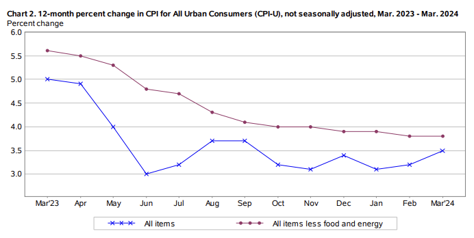 미국은 CPI 상승률을 볼 때, 전월대비 보다는 전년대비를 좀 더 중요하게 생각합니다. 아래 표는 전년대비 CPI 상승률인데, '24년 3월 현재 전년 대비 3.5% 상승률을 기록했습니다. (아래 표에서 파란색 선)