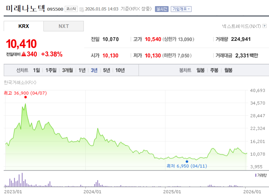 미래나노텍은 본래 TV용 광학필름 시장의 강자였지만, 최근에는 자회사 미래첨단소재를 통해 수산화리튬 등 2차전지 핵심 소재 기업으로 변신하며 투자자들의 큰 관심을 받고 있습니다. 2026년 1월 현재 주가는 과거 리튬 열풍 당시의 고점보다는 낮아진 1만 원 초반대에서 지지선을 형성하며 새로운 반등 기회를 엿보고 있는 상황입니다. 가장 기대되는 부분은 최근 전기차 배터리의 성능을 높여주는 '무수리튬' 양산에 돌입했다는 소식인데, 이는 국산화 수요가 높은 분야라 향후 실적 개선의 강력한 엔진이 될 것으로 보입니다. 다만, 글로벌 리튬 가격의 변동성이 주가에 즉각적으로 영향을 미치는 경향이 있어, 원자재 시장의 흐름을 주기적으로 체크해야 한다는 점은 투자 시 꼭 기억해야 할 주의사항입니다. 실적 면에서는 안정적인 캐시카우인 광학필름 사업이 버텨주는 가운데, 매출 비중이 점점 커지고 있는 2차전지 소재 부문의 이익률이 얼마나 회복되느냐가 주가 상단의 잠금장치를 푸는 열쇠가 될 전망입니다. 수급적으로는 개인 투자자들의 비중이 다소 높은 편이라 주가 변동성이 클 수 있으며, 외국인이나 기관의 의미 있는 매수세가 연속적으로 유입되는지를 확인하는 것이 중요합니다. 차트상으로는 오랫동안 이어온 하락 추세를 멈추고 1만 1천 원선을 강하게 뚫어준다면, 본격적인 추세 전환의 신호탄으로 볼 수 있습니다. 결론적으로 미래나노텍은 본업의 안정성과 신사업의 성장성을 동시에 가진 종목으로, 리튬 가격 안정화와 함께 2차전지 섹터의 온기가 돌아올 때 가장 먼저 반응할 후보군 중 하나입니다.