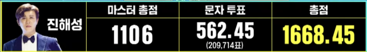 진해성은 준결승전 신곡 미션 최종 결과 총점 1,668점을 기록해 준결승 4위로 결승전에 진출했습니다.
