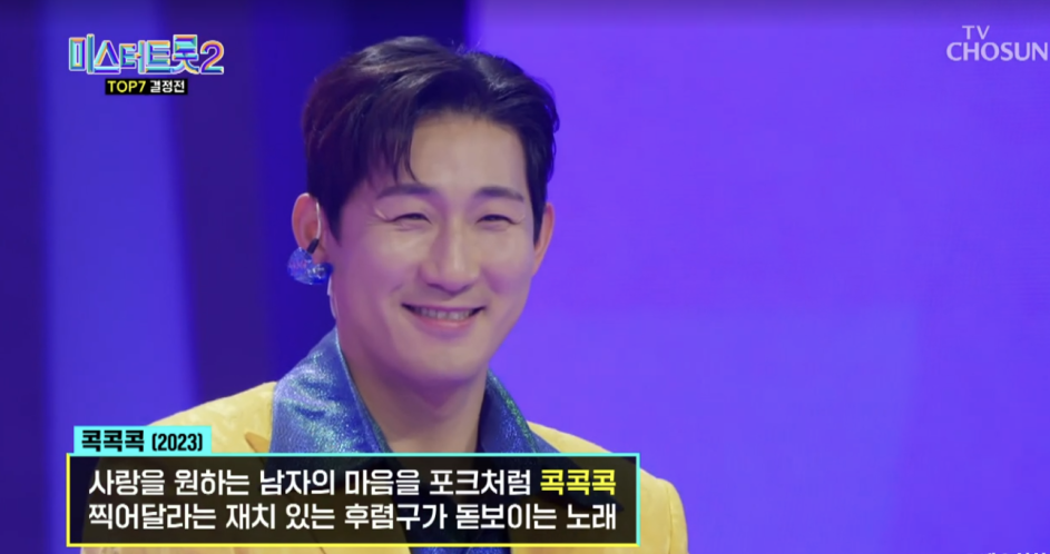 나상도는 뽕모르 팀이 작곡한 '콕콕콕'을 선곡했습니다. '콕콕콕'은 사랑을 원하는 남자의 마음을 포크처럼 콕콕콕 찍어달라는 재치 있는 후렴구가 돋보이는 노래로, 많은 참가자가 탐냈던 곡이라고 합니다.