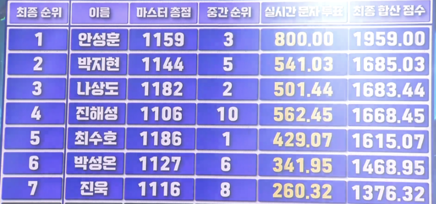 준결승전은 마스터 총점(1200점 만점) + 문자 투표(800점 만점) 점수를 합산하여 최종 점수를 계산합니다.