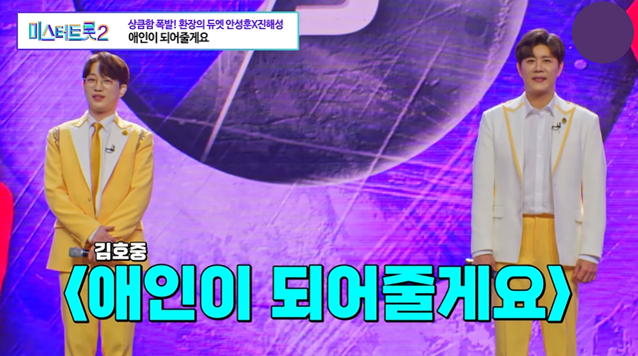 1라운드 1위 명불허전 현역 안성훈과 5위 정통 트롯 끝판왕 진해성이 만나 불꽃 튀는 격돌을 했습니다. 두 사람은 김호중의 '애인이 되어줄게요'를 선곡했습니다. 여태까지 퍼포먼스에 취약한 모습을 보여주었던 진해성은 볼에 바람을 넣고 신나게 리듬을 타며 제대로 작정한 무대를 보여주었습니다.