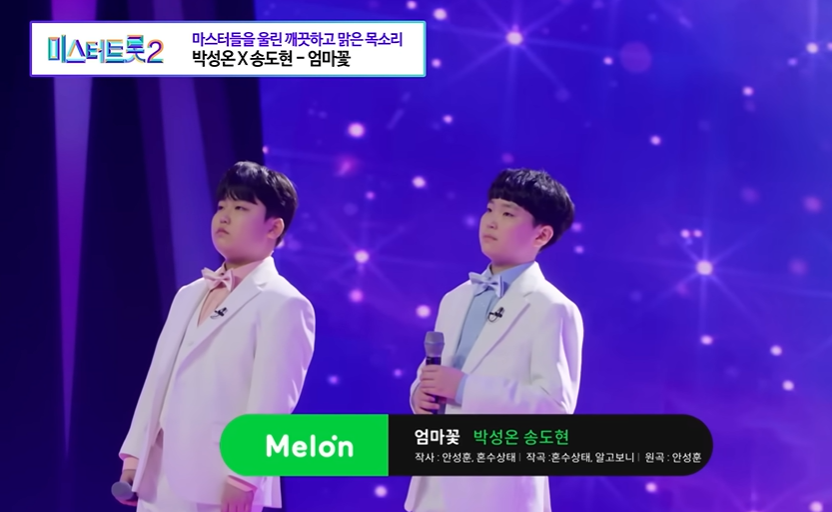 1라운드 4위 트롯 천재 박성온과 7위 꺾기 요정 송도현이 만났습니다. 두 사람은 안성훈이 직접 작사에 참여하여 만든 곡 안성훈의 '엄마꽃'을 선곡했습니다. 송도현은 이 노래를 연습하다가 엄마와 가족 생각에 눈물을 훔치는 모습을 보여주었습니다. 두 사람은 마음을 적시는 청량하고 깨끗한 목소리로 관객과 마스터의 마음도 적시며 깊은 감동을 선사했습니다.