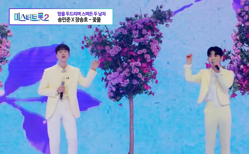 1라운드 14위 수묵화 보이스 송민준과 1라운드 15위 트롯 신동 장송호가 만났습니다. 두 사람은 신유의 '꽃물'을 선곡했습니다. 두 사람은 봄날같이 화사한 노란빛 슈트를 맞춰 입고 꽃처럼 아름다운 보이스를 뽐냈습니다.