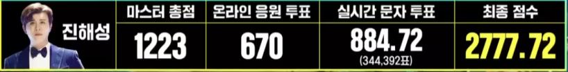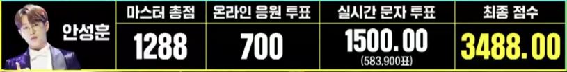 안성훈은 결승전 인생곡 미션 최종 결과 총점 3,488점을 기록해 결승 1위로 진(眞)을 차지했습니다.