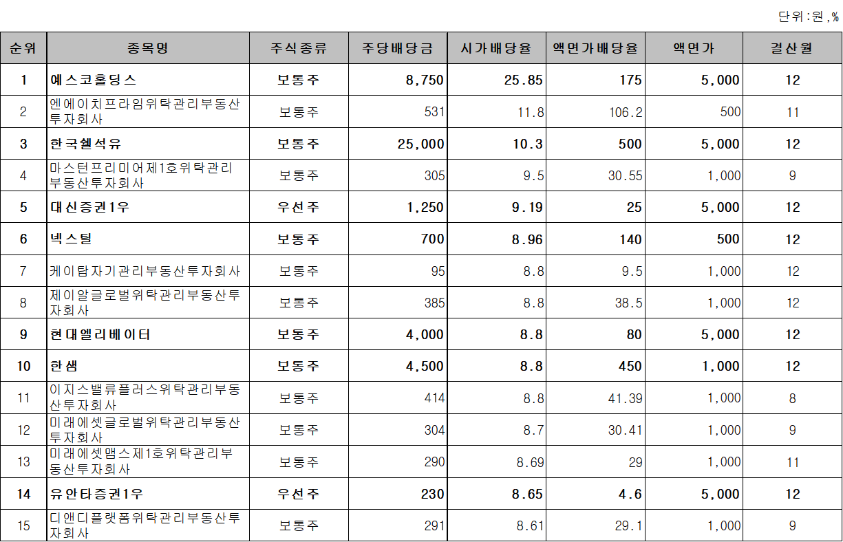1위는 예스코홀딩스로, 시가배당률이 약 26%에 달할 정도로 높은 배당율을 기록하였습니다. 그 외 한국쉘석유, 대신증권1우, 넥스틸 등이 시가배당률 8% 이상을 기록하며 고배당주에 등극 하였습니다. 다만, 이렇게 지나치게 높은 배당 수익률은 일시적일 수 있으니, 그 동안의 추이를 잘 살펴봐야 하겠습니다.