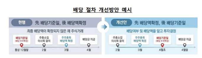 [ 주요 내용 ] [과제1] 상법 유권해석, 자본시장법 개정을 통해 배당액을 보고 투자를 결정할 수 있도록 배당절차를 개선하겠습니다. [과제2] 상장회사 표준정관을 개정하여 안내하고 거래소 기업