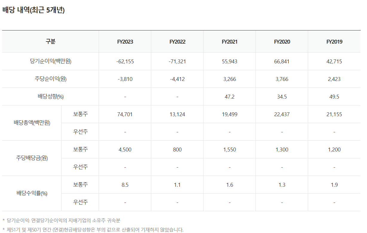 한샘은 지난 '22~'23년에 순손실을 기록하면서도 배당을 실시하였고, 올해도 엄청난 고배당을 실시하고 있습니다.