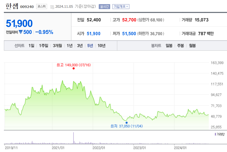 한샘의 최근 5년간의 주가를 보면, 코로나 기간 부동산 시장이 활황이면서 전고점을 형성하였다가, 현재는 전고점 대비 1/3 수준의 주가를 보이고 있습니다. 부동산 시장이 일부 회복하는 기미가 보이고는 있다고 하나, 아직까지 높은 금리로 인해 모멘텀을 가지기는 어려운 상황으로, 향후 금리가 인하되며 부동산 시장이 살아난다면 한샘 주가 역시 다시금 기대해 볼 수 있는 가능성이 있습니다.