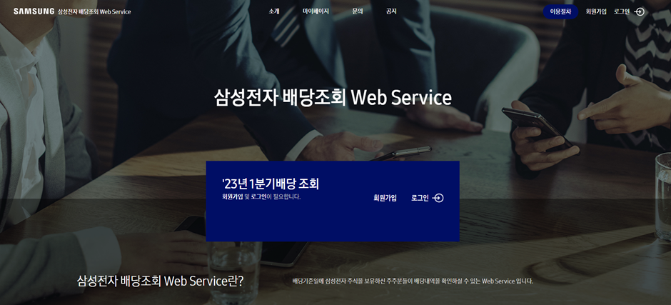 혹시라도 배당금 지급 대상인지 헷갈리신다면, 삼성전자 배당조회 Web Service를 통해 배당금 지급 대상인지 확인 가능합니다. 다만, 현재는 조회가 불가하며, 배당 일정이 발표된 이후 조회가 가능합니다.