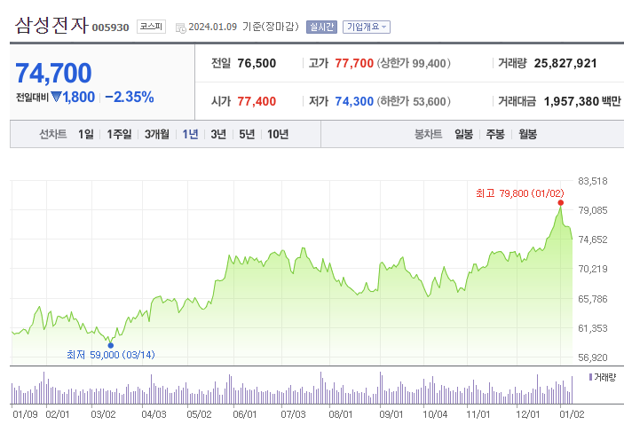 1. 삼성전자 주가 삼성전자의 최근 1년 주가를 보면, 반등세에 있는 모습을 볼 수 있습니다. '22년 9월 말 최저점을 지나 지속적으로 반등 중에 있으나, 아직까지는 힘이 약한 모습입니다. 한 때 주