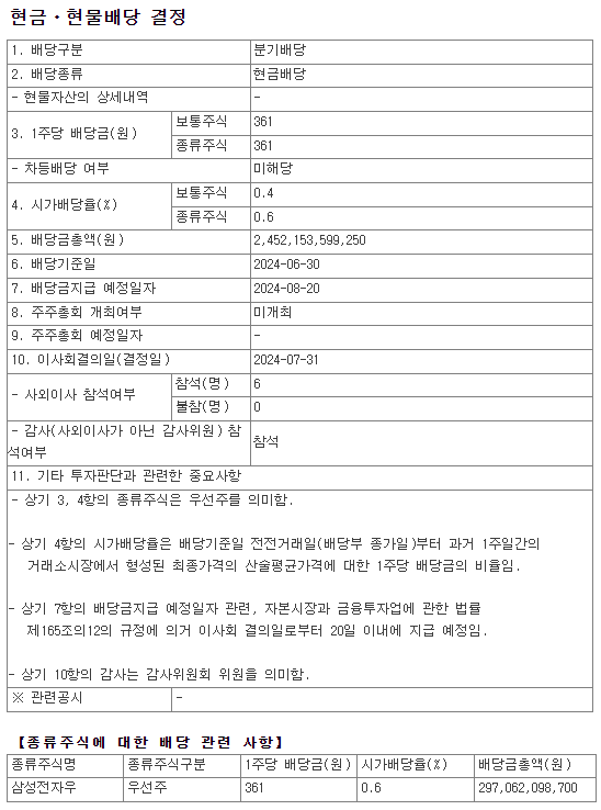 삼성전자, 2024년 2분기 실적 및 배당 공시!! (분기배당, 반기배당, 중간배당, 주가, 배당일, 지급일