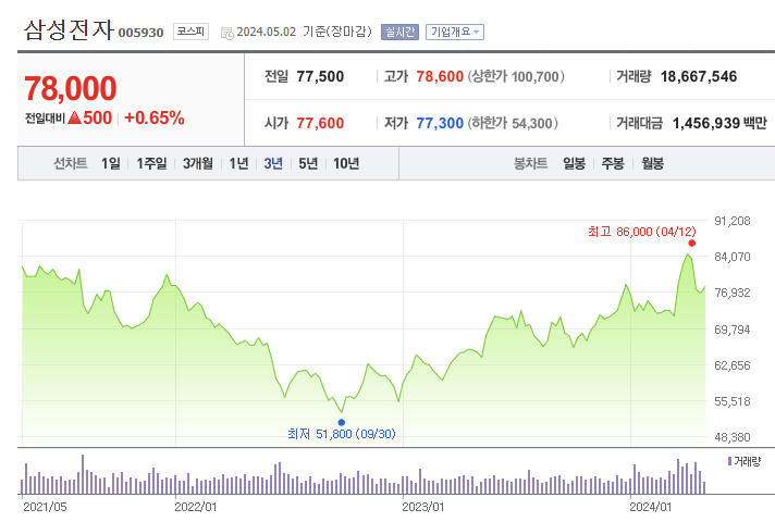 삼성전자의 최근 주가를 보면, 반등세에 있는 모습을 볼 수 있습니다. '22년 9월 최저점을 지나 지속적으로 반등 중에 있으나, 아직까지는 힘이 약한 모습입니다. 한 때 주식인들 사이에서 소위 '십만전자'라고 불리며 10만원을 눈앞에 뒀었던 삼성전자의 주가가 향후 어떻게 될지 주목해야겠습니다.