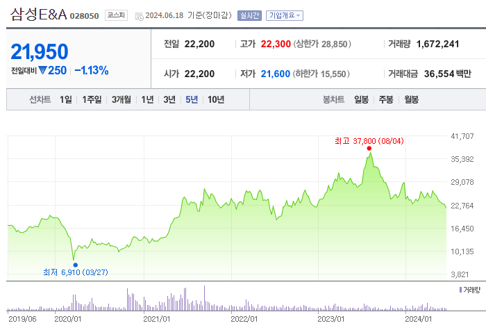 삼성 E&A는 지난 '23년 중반 반등세를 보였으나, 다시 하락 흐름을 보이고 있습니다. 저점이라는 분석도 있지만, 현재까지는 별다른 주가 상승의 모멘텀이 보이지 않는 상황으로 투자에는 신중해야 할 것으로 보입니다.