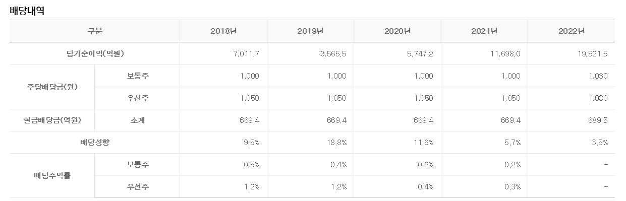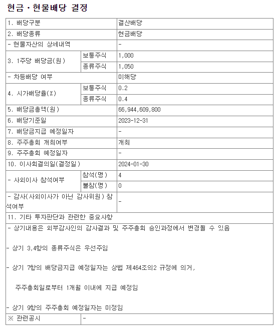 배당금 : 보통주 1,000원 / 우선주 1,050원